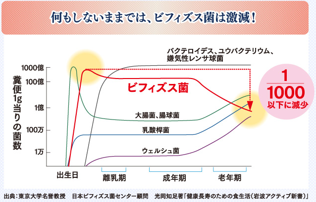 またビフィズス菌は年齢を重ねるごとに私たちの大腸の中からビフィズス菌が減少するのです。