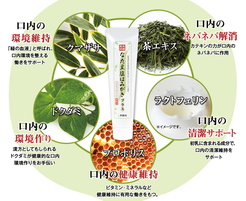 なた豆塩はみがきプラスにはさらに5種類の天然成分を配合し、口内環境を整え、口臭・歯周病を予防します。